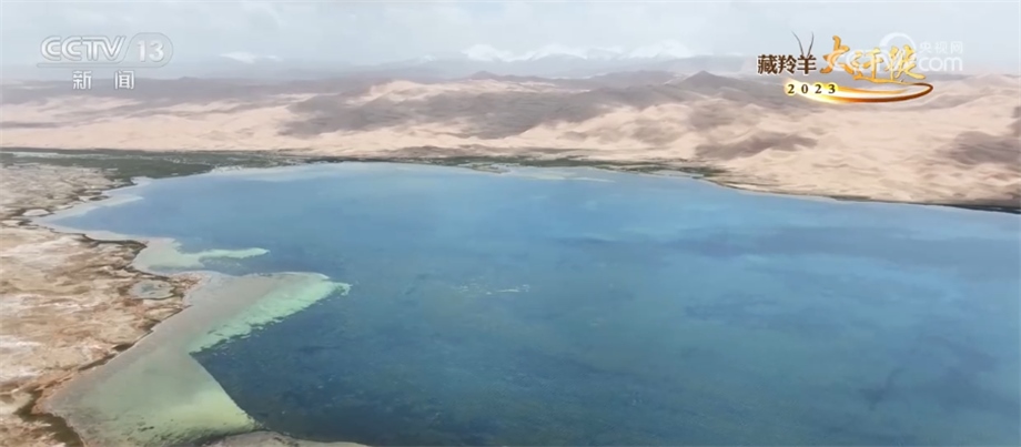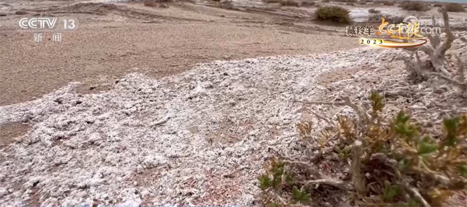 總臺記者 崔寧:你看這個鹽堿地長的是典型的沙漠性植物,然后一路鹽堿,到前面就是浩瀚的阿雅克庫木湖。這是阿爾金山最大的湖泊,這兒的海拔有4300米左右,所以我們在這個鏡頭當中就看到特別奇特的景象,植物、鹽堿、鹽花、水、大片大片的湖泊,非常神奇。