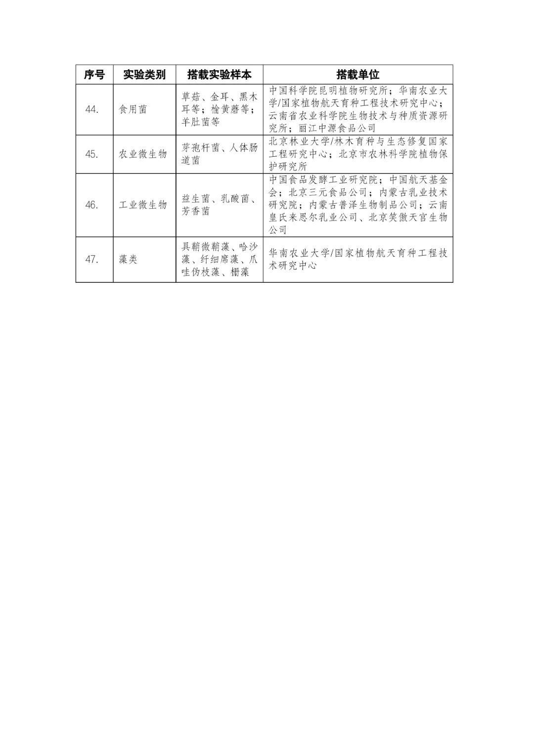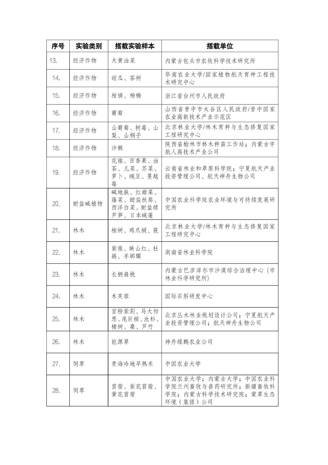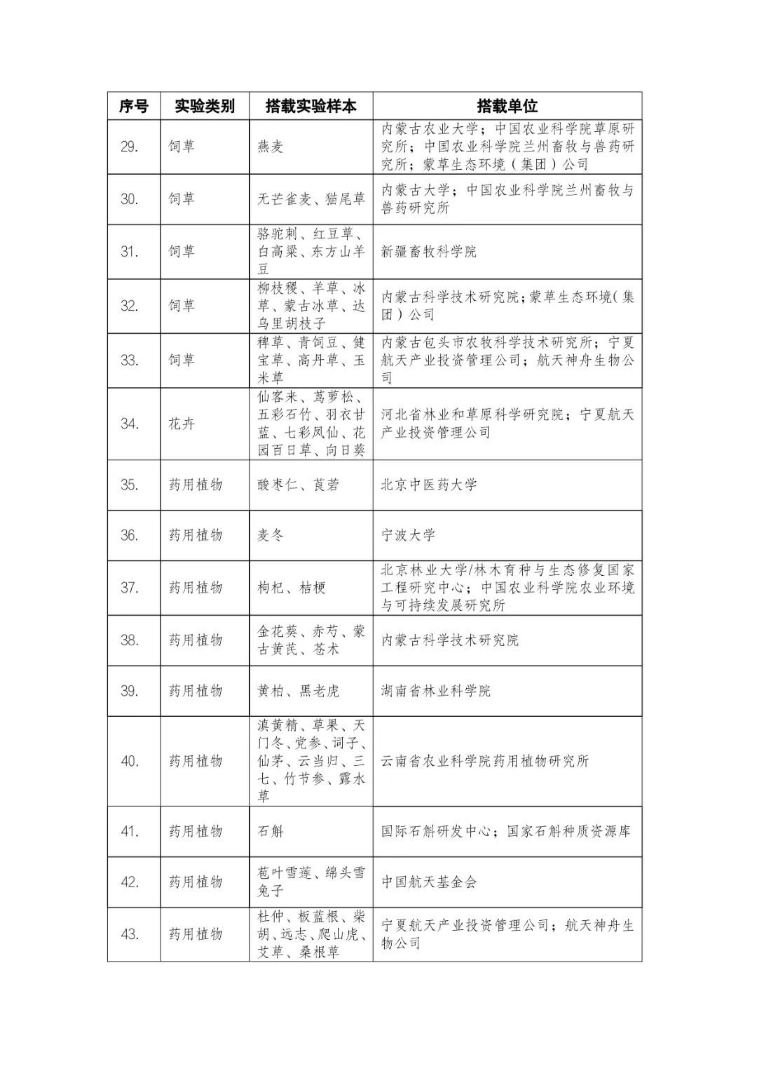 載人航天工程立項(xiàng)實(shí)施以來,始終注重提升工程綜合效益,致力服務(wù)國家經(jīng)濟(jì)社會(huì)發(fā)展。在工程歷次飛行任務(wù)中,均安排了航天育種搭載實(shí)驗(yàn)項(xiàng)目。從神舟十六號(hào)載人飛船開始,中國載人航天工程辦公室向社會(huì)公開征集航天育種搭載實(shí)驗(yàn)項(xiàng)目,于3月23日在工程官網(wǎng)發(fā)布《關(guān)于征集神舟系列載人飛船航天育種實(shí)驗(yàn)項(xiàng)目的機(jī)會(huì)公告》,同時(shí)在工程官網(wǎng)開辟“航天育種搭載實(shí)驗(yàn)”管理平臺(tái),接受搭載需求單位申報(bào)實(shí)驗(yàn)項(xiàng)目。辦公室組織專家對申報(bào)項(xiàng)目進(jìn)行評審,遴選出53個(gè)單位的136種份航天育種實(shí)驗(yàn)材料實(shí)施搭載。包括農(nóng)作物47份(糧食作物種子12份、經(jīng)濟(jì)作物種子28份、耐鹽堿植物7份);林草、花卉和藥用植物76份(林木17份、飼草21份、花卉7份、藥用植物31份);微生物和其它13種(農(nóng)業(yè)微生物菌種2種、工業(yè)微生物菌種3種、食用菌3種、藻類和苔蘚5種)(清單附后)。