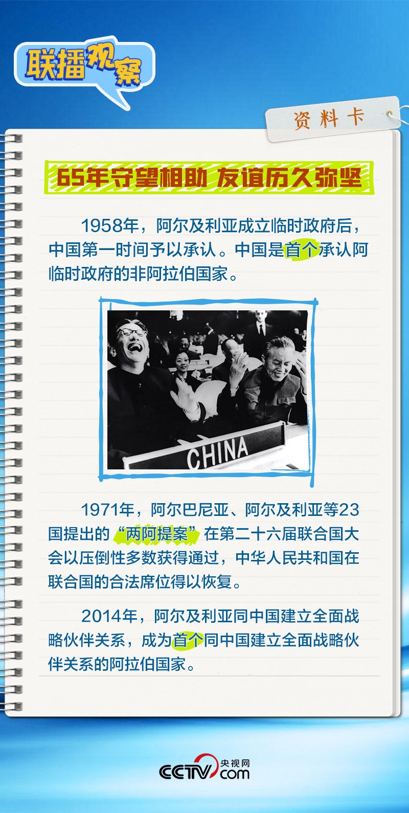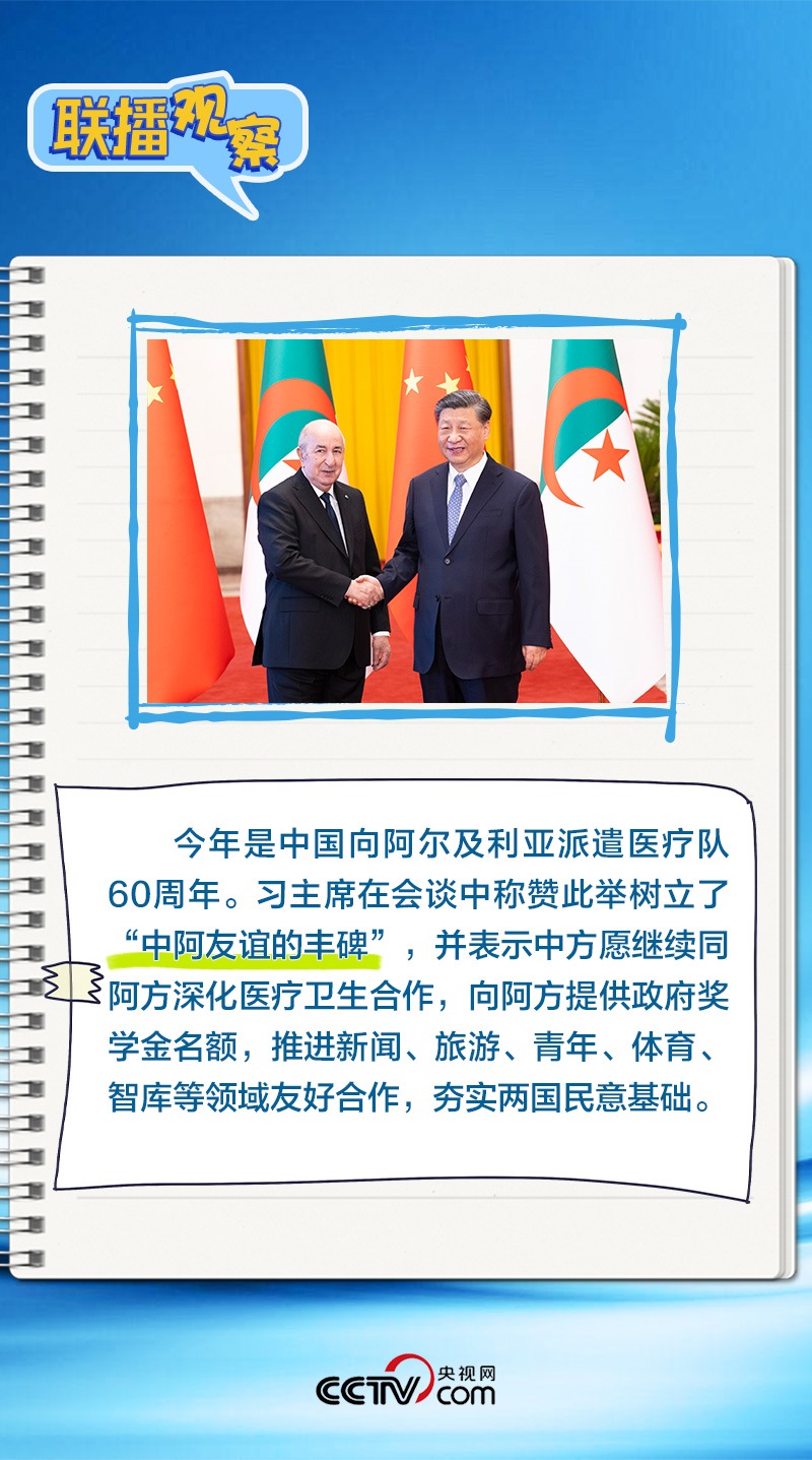 會(huì)談中,習(xí)主席特別提到,今年是中國(guó)向阿爾及利亞派遣醫(yī)療隊(duì)60周年,并稱贊此舉樹立了“中阿友誼的豐碑”。中阿傳統(tǒng)友誼深厚,兩國(guó)始終相互尊重、平等相待、彼此支持,締造了一段段友好交往的佳話。
