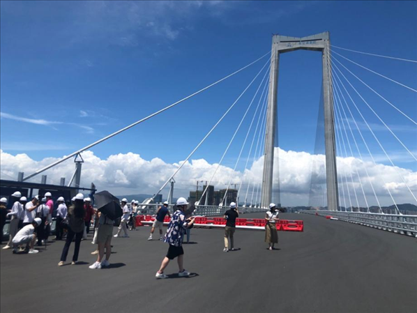 在中山市深中通道中山大橋段采風(fēng)點,采風(fēng)團(tuán)成員踏上已完成鋪裝的橋面,近距離一睹大橋“英姿”。在建的深中通道連接廣東省境內(nèi)的深圳、中山兩市,全長約24公里。建成通車后,從中山到深圳開車可在半小時內(nèi)到達(dá),大大縮短了中山至深圳、香港等地的通行距離。這一建設(shè)工程,對于深化打造珠江口岸“黃金內(nèi)灣”的生活圈,推動粵港澳大灣區(qū)城市群融合發(fā)展具有重要意義。目前,深中通道建設(shè)已進(jìn)入收尾階段,預(yù)計2024年通車。