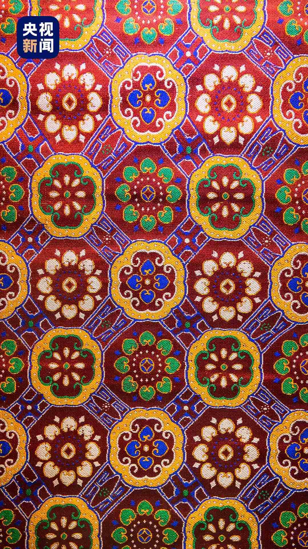 △綬帶正反面主色分別為藍(lán)色、紅色,融入芙蓉花、太陽神鳥、棋盤格等元素,在自然光線下反射出不同的色彩。