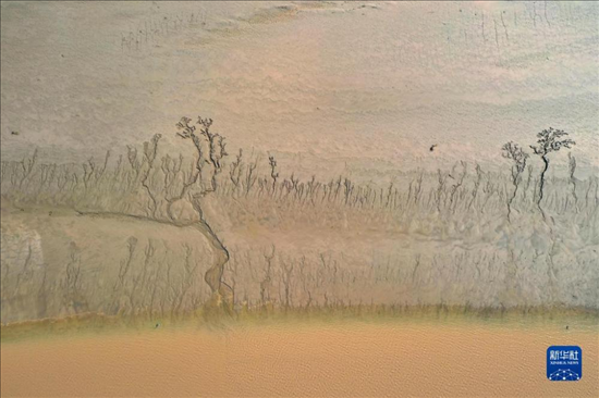 近日,隨著黃河調(diào)水調(diào)沙結(jié)束,黃河河南省開封市黑崗口險工段水位下降。河床被水流沖刷過后呈現(xiàn)出縱橫交錯的“脈絡(luò)”。