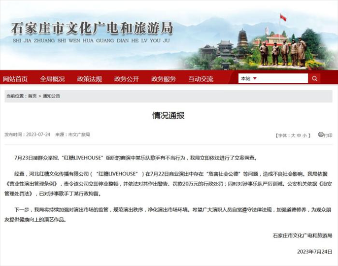 ·石家莊通報(bào)樂隊(duì)歌手商演不當(dāng)行為:涉事者被拘,公司停業(yè)整頓。