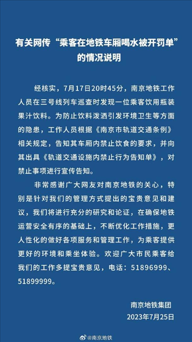 ·南京地鐵通報(bào)女子喝水被開罰單:系果汁,依規(guī)出具告知單。