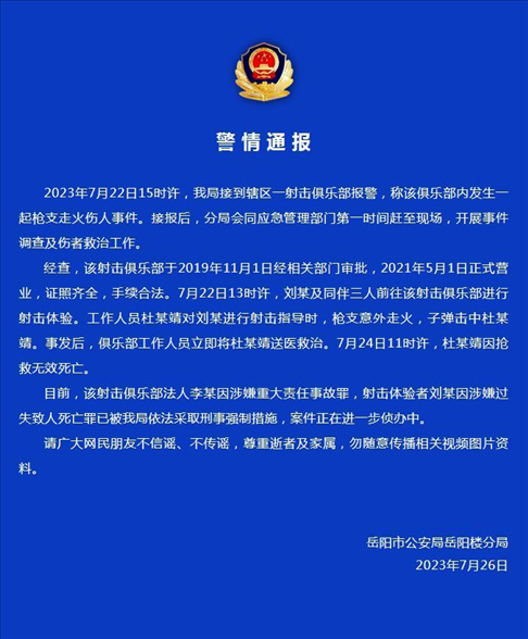 ·岳陽警方通報(bào)一俱樂部槍支走火致工作人員死亡事件。