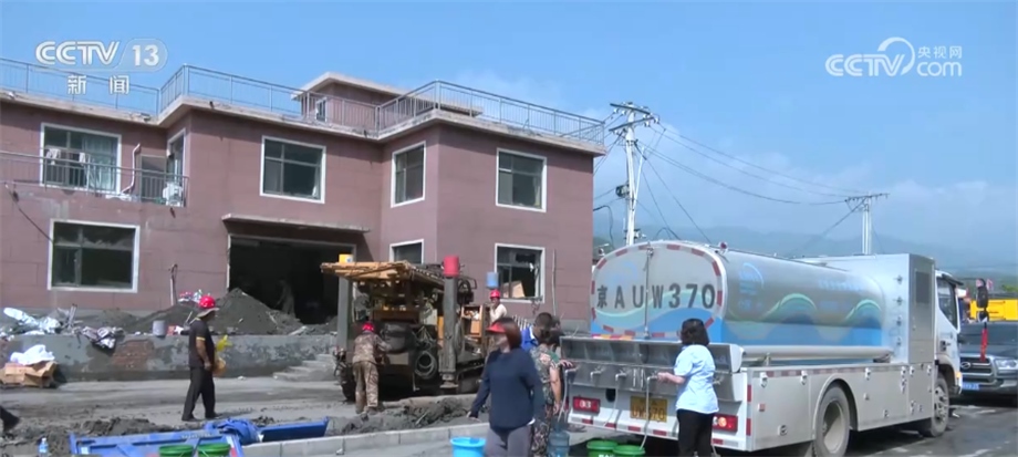 在北京市房山區(qū)西班各莊村,由于洪水侵襲,當?shù)厮淳粵_毀,230戶村民出現(xiàn)飲水困難。當?shù)厮块T立即派出應急送水車,同時集結(jié)勘探隊、機械設備,用最快的速度更新水源。?