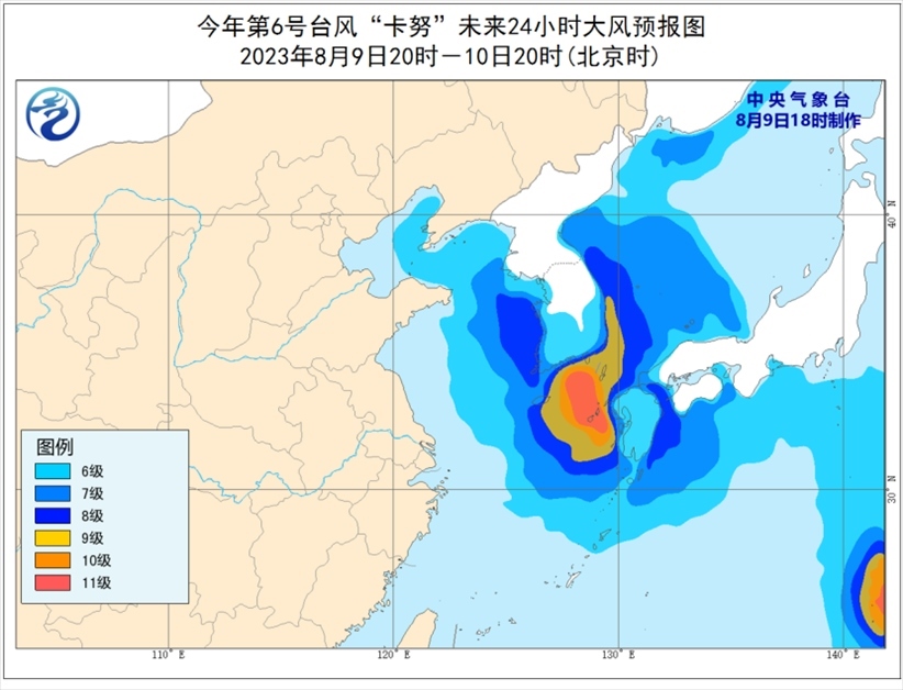 9日20時至10日20時,渤海東部、渤海海峽、黃海大部海域、東海東部海域將有6-7級、陣風8-9級的大風,其中黃海中部和南部偏東海域、東海東北部偏東海域風力可達8-9級,“卡努”中心經過的附近海域風力可達10-11級、陣風12-13級;遼東半島沿岸也將有5-6級大風,陣風可達7-8級。