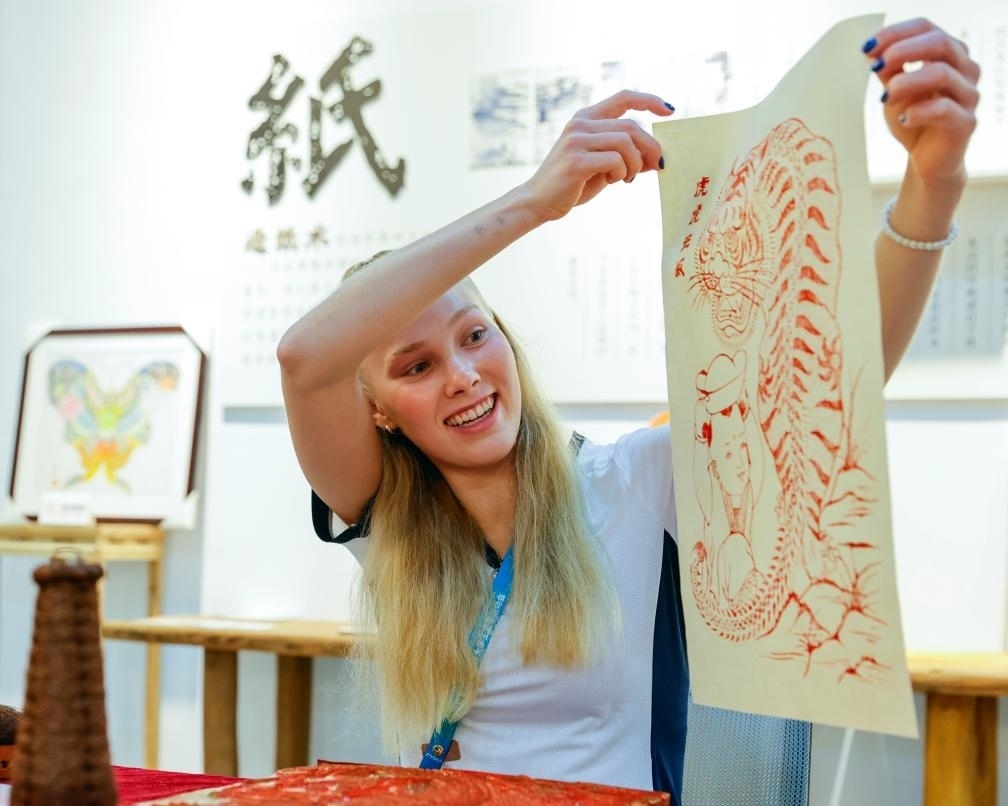 8月3日,在成都大運(yùn)村的互動體驗中心,芬蘭運(yùn)動員杰茜卡·卡哈拉展示自己制作的夾江年畫。新華社記者 沈伯韓 攝