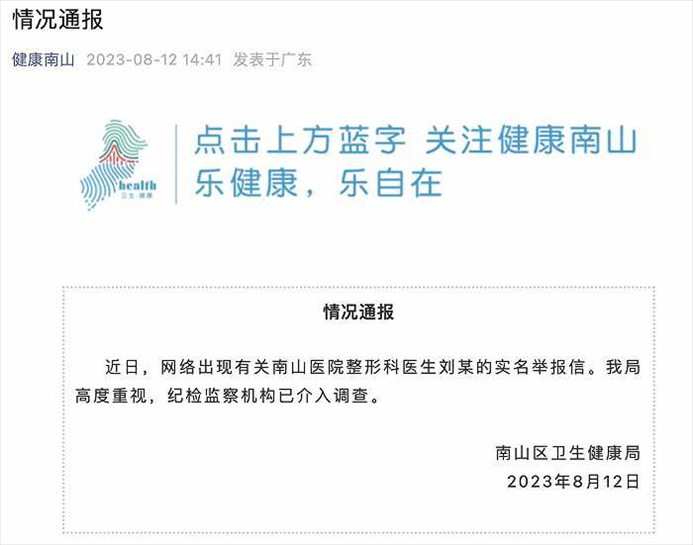 ·網(wǎng)傳南山醫(yī)院整形科醫(yī)生劉某被實名舉報,官方通報:紀(jì)檢監(jiān)察機構(gòu)已介入調(diào)查。