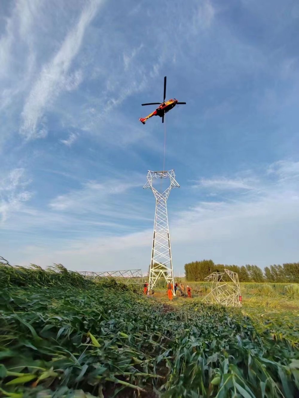 9日,在海林市110千伏長海輸電線路搶修現(xiàn)場,一架直升機吊裝起沉重的輸電鐵塔,運送到指定地點。這個輸電鐵塔處于河流中心島位置,無法使用常規(guī)起重設備。國家電網(wǎng)公司迅速從國網(wǎng)遼寧電力、國網(wǎng)空間技術公司等單位調(diào)配直升機支援黑龍江,解決輸電鐵塔吊裝、運輸?shù)葐栴}。