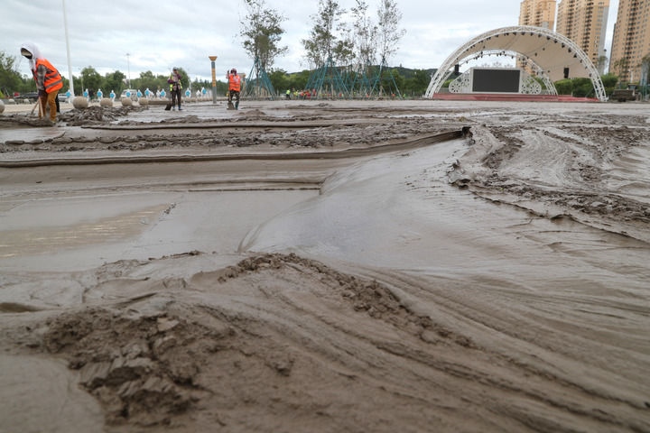 鏟車鏟起路上的大塊淤泥倒入翻斗車,工人們有的手拿鐵鍬清理人行道,有的用水槍沖刷路面……9日下午,在尚志市東浦新區(qū)一座公園附近的道路上,洪水退去后的清淤工作正在進行。