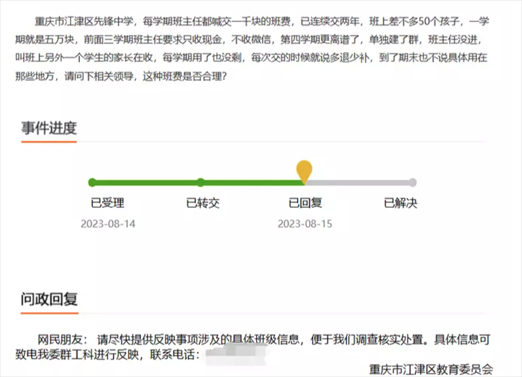 ·重慶江津某中學(xué)一班級收5萬元班費(fèi),每人一學(xué)期交1000元。區(qū)教委:已啟動調(diào)查程序,督促學(xué)校自查。