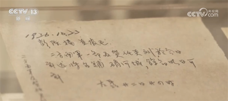 六盤山紅軍長(zhǎng)征紀(jì)念館館長(zhǎng) 李玲:在我們紀(jì)念館里也陳列展出了一組非常珍貴的、紅軍長(zhǎng)征過程當(dāng)中的電文,其中有一張就是1936年10月22日,您看在這里,這個(gè)日子也是紅一和紅二方面軍在西吉將臺(tái)堡勝利會(huì)師的日子。