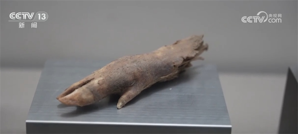 嘉峪關(guān)市紅領(lǐng)巾講解員 辛宇軒:這個(gè)是漢代豬蹄,是守衛(wèi)邊疆士卒們留下來的遺存之物,距今2000余年,是極為難得的長城文物。我們可以看得出來,它的骨架、腳趾保存都是相對完好的,這是野豬的豬蹄,我們這邊氣候干燥,所以就不會(huì)把它給腐蝕掉。