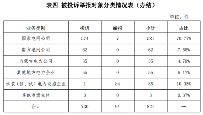 從被投訴舉報對象看,供電企業(yè)733件、占投訴舉報總數(shù)的89.28%,其中國家電網(wǎng)公司581件、占比70.77%,南方電網(wǎng)公司62件、占比7.55%,內(nèi)蒙古電力公司35件、占比3.65%,其他地方電力企業(yè)55件、占比6.17%;承裝(修、試)電力設(shè)施企業(yè)85件、占比10.35%;其他市場主體3件、占比0.37%。