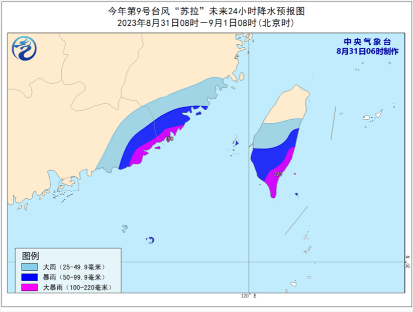 降雨方面,受臺風(fēng)“蘇拉”和南下冷空氣共同影響,8月31日至9月3日,廣東大部、福建中南部、臺灣南部有大到暴雨,廣東中東部、福建東南部有大暴雨、沿海局地特大暴雨。其中,今天白天到夜間,福建東南部、廣東東部、臺灣島中南部的部分地區(qū)有大到暴雨,局地有大暴雨(100-220毫米)。另外,9月2日起受臺風(fēng)“??庇绊?,浙江等地將有較強(qiáng)降雨。