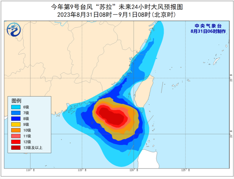 受“蘇拉”影響,今天白天到夜間,巴士海峽、臺灣海峽、南海東北部、福建沿海、廣東中東部沿海、臺灣島南部沿海、東沙群島將有6~8級、陣風(fēng)9~10級的大風(fēng),其中巴士海峽偏西海域、南海東北部海域、東沙群島的風(fēng)力有9~11級,部分海域風(fēng)力可達(dá)12~13級,“蘇拉”中心經(jīng)過的附近海面風(fēng)力有14~17級、陣風(fēng)17級以上。