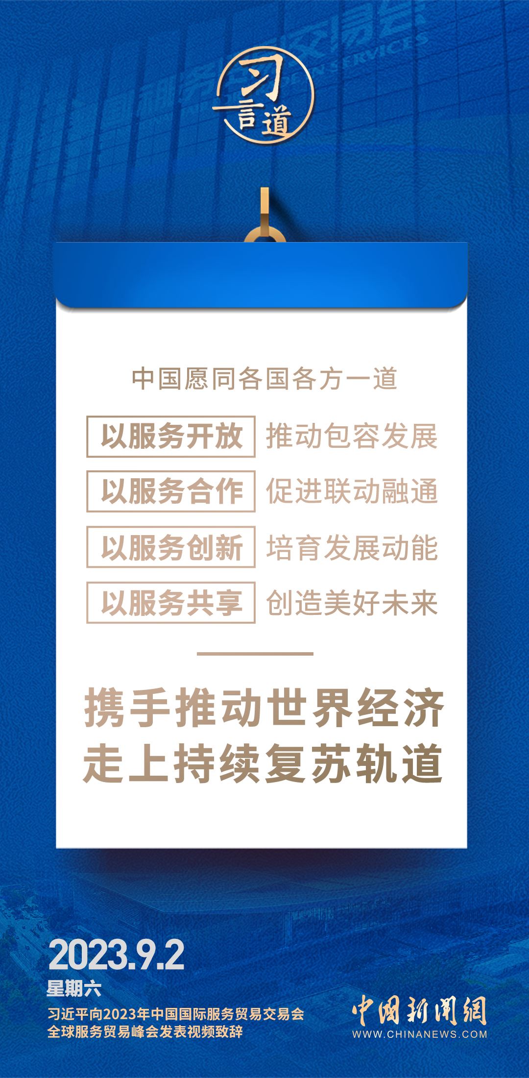 9月2日上午,國家主席習近平在北京向2023年中國國際服務(wù)貿(mào)易交易會全球服務(wù)貿(mào)易峰會發(fā)表視頻致辭。習近平指出——