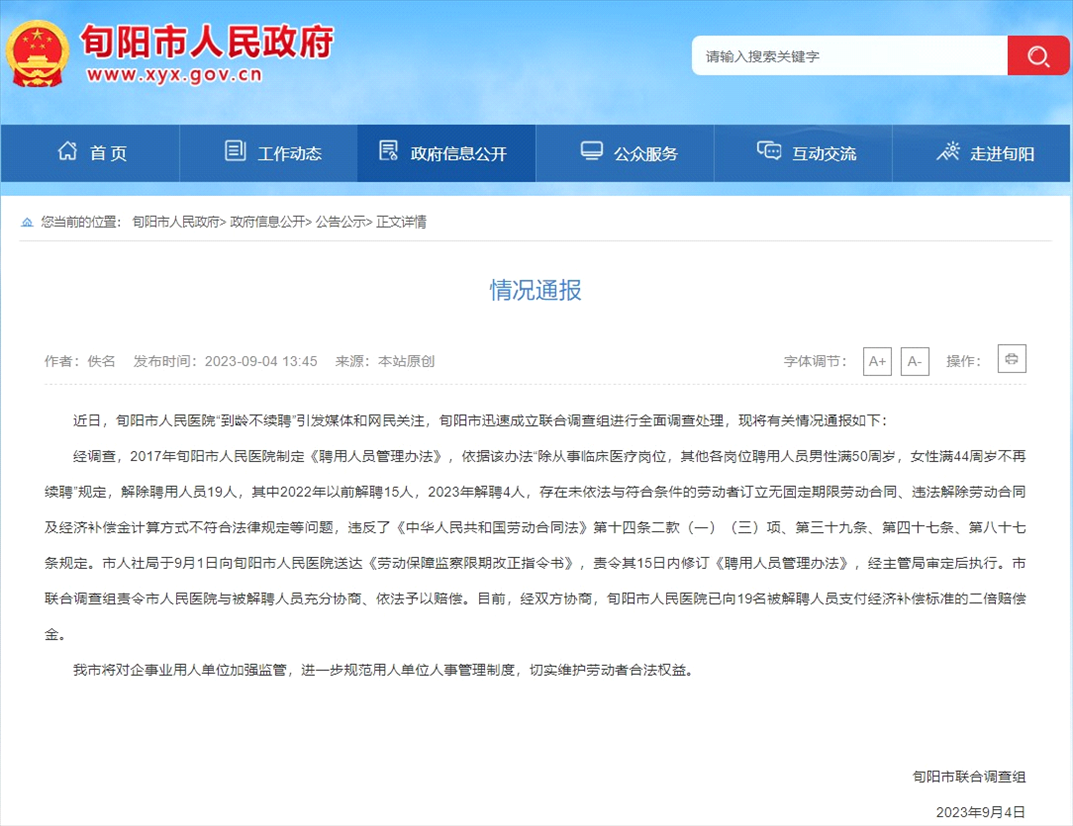 ·陜西旬陽(yáng)一醫(yī)院規(guī)定“到齡不續(xù)聘”,旬陽(yáng)市政府回應(yīng):責(zé)令限期改正,支付兩倍賠償。
