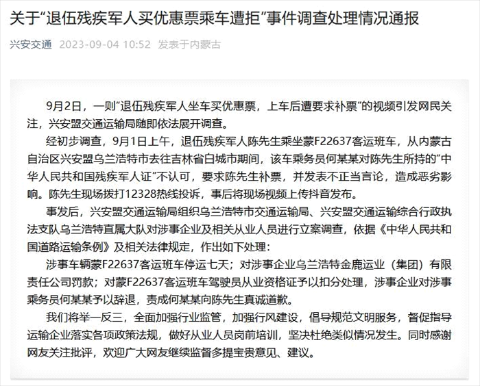 ·興安盟交通運(yùn)輸局通報(bào)“退伍殘疾軍人買(mǎi)優(yōu)惠票乘車(chē)遭拒”:涉事乘務(wù)員被辭退。