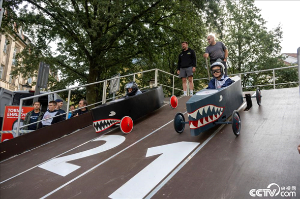 德國(guó)巴伐利亞州科堡舉行肥皂盒汽車(chē)比賽。參賽者將車(chē)子打扮成各種奇怪的造型,在沒(méi)有動(dòng)力的情形下滑下坡道,完成比賽。