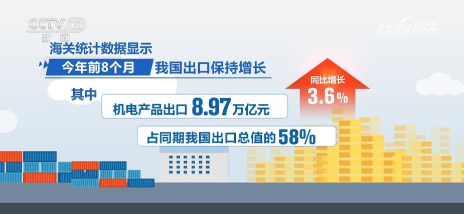 海關(guān)統(tǒng)計數(shù)據(jù)顯示,2023年前8個月,我國出口保持增長,其中,機(jī)電產(chǎn)品出口8.97萬億元,同比增長3.6%,占同期我國出口總值的58%;汽車及零配件、船舶、電工器材出口分別增長50.1%、28%、18.6%。