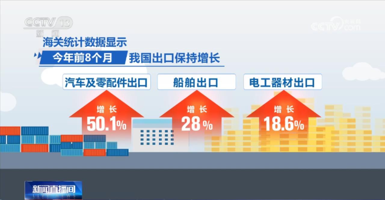 今年前8個(gè)月,我國(guó)出口保持增長(zhǎng)。其中,機(jī)電產(chǎn)品出口8.97萬(wàn)億元,同比增長(zhǎng)3.6%,占同期我國(guó)出口總值的58%;汽車及零配件出口、船舶出口、電工器材出口分別增長(zhǎng)50.1%、28%、18.6%。