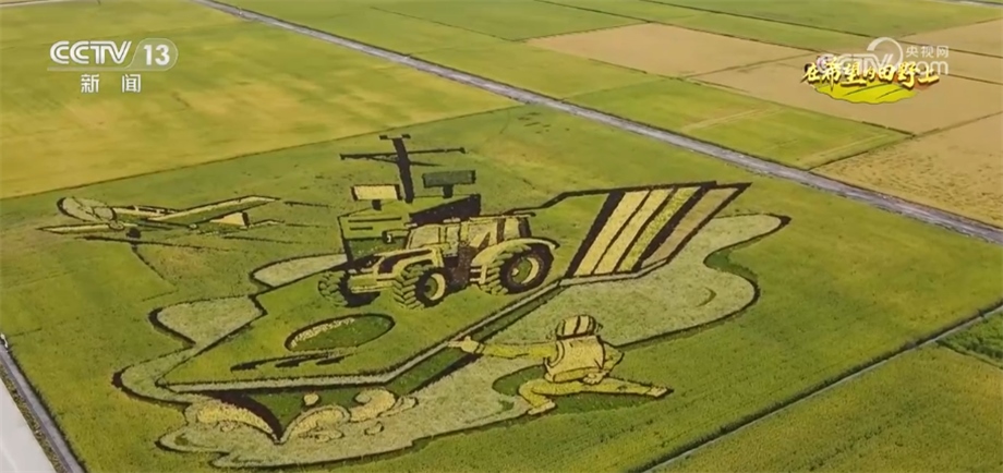 總臺(tái)央視記者 蔣樹林:金秋9月的稻田是什么顏色的?9月的稻香又是什么味道?來這里,有可能會(huì)找到您想要的答案。我現(xiàn)在是在黑龍江北大荒閆家崗農(nóng)場(chǎng)。大家來看,這個(gè)稻田觀景臺(tái)有十多米高,因此站在這里,秋日稻田大片的圖案映入眼簾,今年稻田畫以“鄉(xiāng)村振興”“數(shù)字農(nóng)業(yè)”為主題,生動(dòng)展現(xiàn)了“讓農(nóng)業(yè)更美好、讓農(nóng)民更幸?!钡拿篮迷妇啊5咎锂嬍寝r(nóng)民們勤勞與智慧的展現(xiàn),他們用稻田畫為家鄉(xiāng)水稻代言,而對(duì)于在黑土地打拼的北大荒人而言,還有更重要的意義。