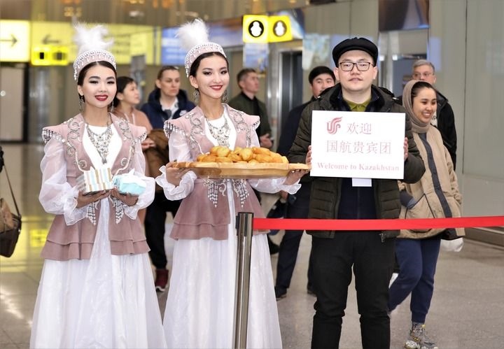 4月21日,在哈薩克斯坦首都阿斯塔納的納扎爾巴耶夫國際機(jī)場,哈方工作人員為搭乘國航北京-西安-阿斯塔納航線首班飛機(jī)抵達(dá)的旅客舉行歡迎儀式。