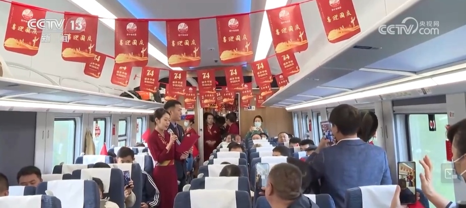 車廂內(nèi)掛滿了國(guó)慶主題的旗幟、窗花,“天路格桑花”文藝小分隊(duì)揮動(dòng)著手中的五星紅旗,與旅客齊聲合唱《我和我的祖國(guó)》,還表演了詩(shī)朗誦、快板等節(jié)目,贏得了現(xiàn)場(chǎng)旅客的掌聲。