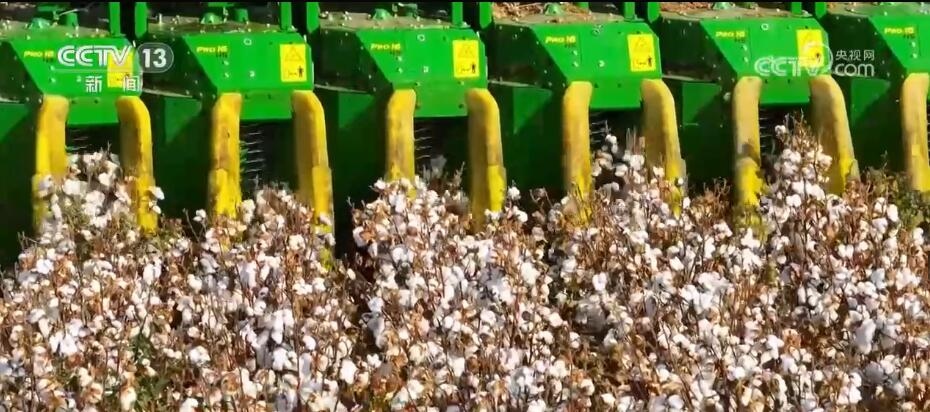 作為棉花主產(chǎn)區(qū),新疆棉花陸續(xù)進(jìn)入采收季?,F(xiàn)在您看到的是位于新疆昌吉瑪納斯縣的棉田。采棉機在田里穿行,所到之處,棉花從棉稈上脫離,氣流將棉花推送到儲存棉箱,采凈率高達(dá)95%以上。這樣一臺采棉機每天可采收700余畝棉花?,敿{斯是國家級優(yōu)質(zhì)商品棉生產(chǎn)基地。從播種到采收,這里的機械化,大大提高作業(yè)速度和棉花質(zhì)量。