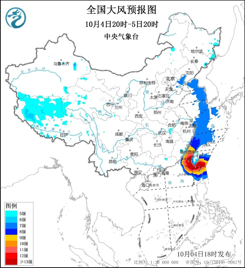 10月5日20時至6日20時,東海西南部海域、臺灣海峽、臺灣以東洋面偏南海域、巴士海峽偏北海域、南海東北部偏北海域?qū)⒂?~8級、陣風9~10級的大風,其中臺灣海峽、南海東北部的部分海域風力可達9~10級、陣風11~12級,臺風“小犬”中心經(jīng)過的附近海域風力可達11~12級、陣風13級;西藏西部、浙江沿海、福建沿海、臺灣島將有5~6級、陣風7級的大風。