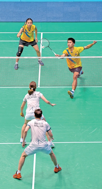 10月4日,杭州亞運(yùn)會羽毛球混合雙打1/8決賽,馬來西亞體育代表團(tuán)組合對陣泰國體育代表團(tuán)組合。圖為雙方運(yùn)動員在比賽中。本報記者 伊霄攝