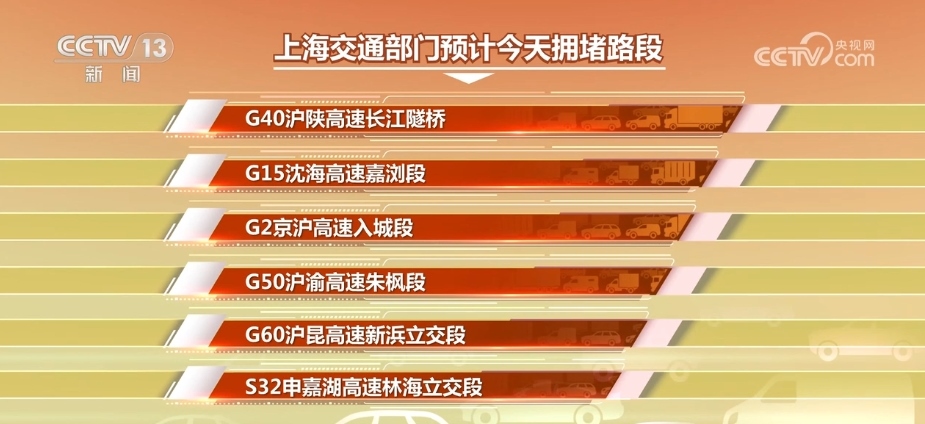 上海交通部門預(yù)計(jì),返程高峰期間,G40滬陜高速長江隧橋、G15沈海高速嘉瀏段、G2京滬高速入城段、G50滬渝高速朱楓段、G60滬昆高速新浜立交段、S32申嘉湖高速林海立交段等入城方向?qū)a(chǎn)生一定擁堵。