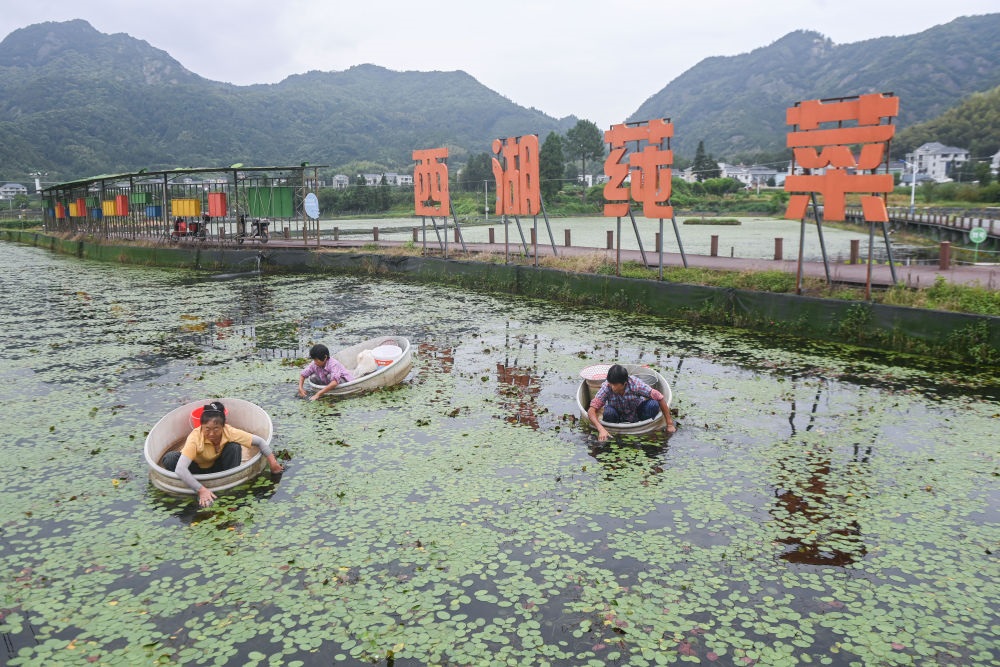 9月5日,在浙江省建德市航頭鎮(zhèn)烏龍村莼菜基地,村民劃著“盆船”在西湖莼菜產(chǎn)業(yè)園種植基地的水面上采摘西湖莼菜。近年來(lái),浙江建德市航頭鎮(zhèn)以黨建聯(lián)建為紐帶,圍繞轄區(qū)特色農(nóng)業(yè)產(chǎn)業(yè)園建設(shè),發(fā)揮新鄉(xiāng)賢、鄉(xiāng)土人才、農(nóng)創(chuàng)客作用,在烏龍村投資600余萬(wàn)元新建了占地1900平方米的西湖莼菜產(chǎn)業(yè)園,引導(dǎo)新鄉(xiāng)賢爭(zhēng)當(dāng)農(nóng)業(yè)致富帶頭人,打造西湖莼菜共富工坊。新華社記者 徐昱 攝