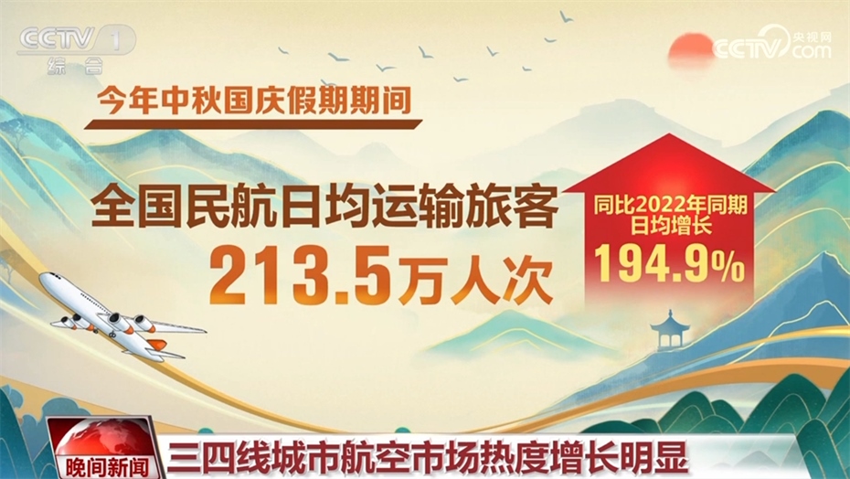 民航方面,今年中秋國慶假期期間,全國民航日均運(yùn)輸旅客213.5萬人次,同比2022年同期日均增長194.9%。除了北京、上海、重慶、三亞等熱門城市航線火爆外,三四線城市的航空市場熱度增長明顯,直接帶動(dòng)了當(dāng)?shù)氐慕?jīng)濟(jì)。
