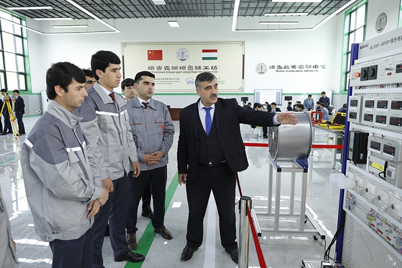 2023年4月12日,在塔吉克斯坦首都杜尚別的魯班工坊內(nèi),塔方教授向?qū)W生講解綠色電能展示平臺的功能與使用方法。