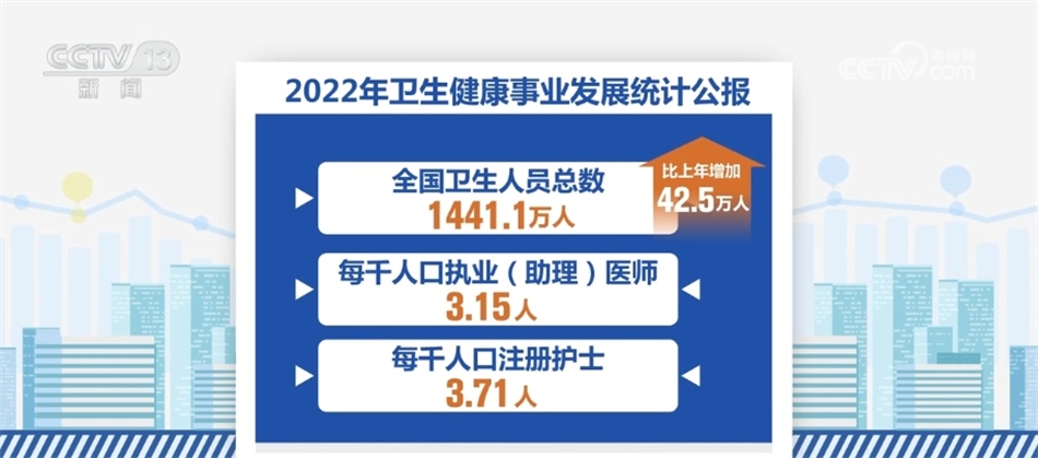 《公報》顯示,我國醫(yī)療衛(wèi)生資源總量繼續(xù)增加。到2022年末,全國醫(yī)療衛(wèi)生機構(gòu)達到1032918個,比上年增加1983個。全國共設置13個類別的國家醫(yī)學中心和兒童類別的國家區(qū)域醫(yī)療中心。全國醫(yī)療衛(wèi)生機構(gòu)床位975.0萬張,每千人口醫(yī)療衛(wèi)生機構(gòu)床位數(shù)由2021年的6.70張增加到2022年的6.92張。全國衛(wèi)生人員總數(shù)1441.1萬人,比上年增加42.5萬人。每千人口執(zhí)業(yè)(助理)醫(yī)師3.15人,每千人口注冊護士3.71人。