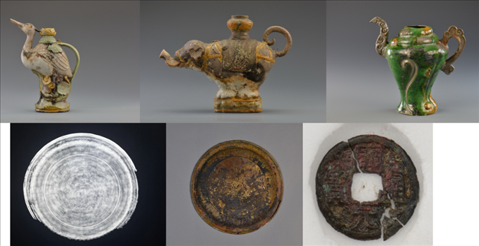 一號沉船遺址有多個(gè)隔艙的船貨堆積,包括陶器、瓷器、銅器、鐵器、竹木器等,數(shù)量超十萬件,代表性器物有醬釉陶罐,琺華梅瓶,青花執(zhí)壺、玉壺春瓶,紅綠彩碗、盤、杯,青釉玉壺春瓶,青白釉盤、碗,白釉三足圓香爐,藍(lán)釉高足碗,單色釉玉壺春瓶、扁壺,素三彩螺形壺、象形壺、鶴形壺,鐵鍋,銅盤、銅錢等。二號沉船遺址發(fā)現(xiàn)大量尺寸相近、碼放整齊的原木及少量陶器、瓷器、蠑螺殼等。