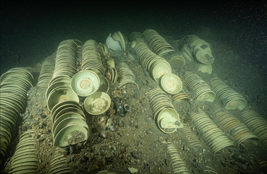 發(fā)掘出水文物標(biāo)本約1.7萬件,主要為龍泉青瓷和陶罐、鉛錘、印章等船上生活、航海相關(guān)文物。其中龍泉青瓷數(shù)量達(dá)到1.6萬余件,器形包括碗、盤、碟、盞、洗、缽、香爐和高足杯等,年代為元代晚期,為典型的外銷貿(mào)易瓷。結(jié)合溫州朔門古港的考古發(fā)現(xiàn),推測該沉船可能是從溫州港出海前往東南亞的民間貿(mào)易商船。