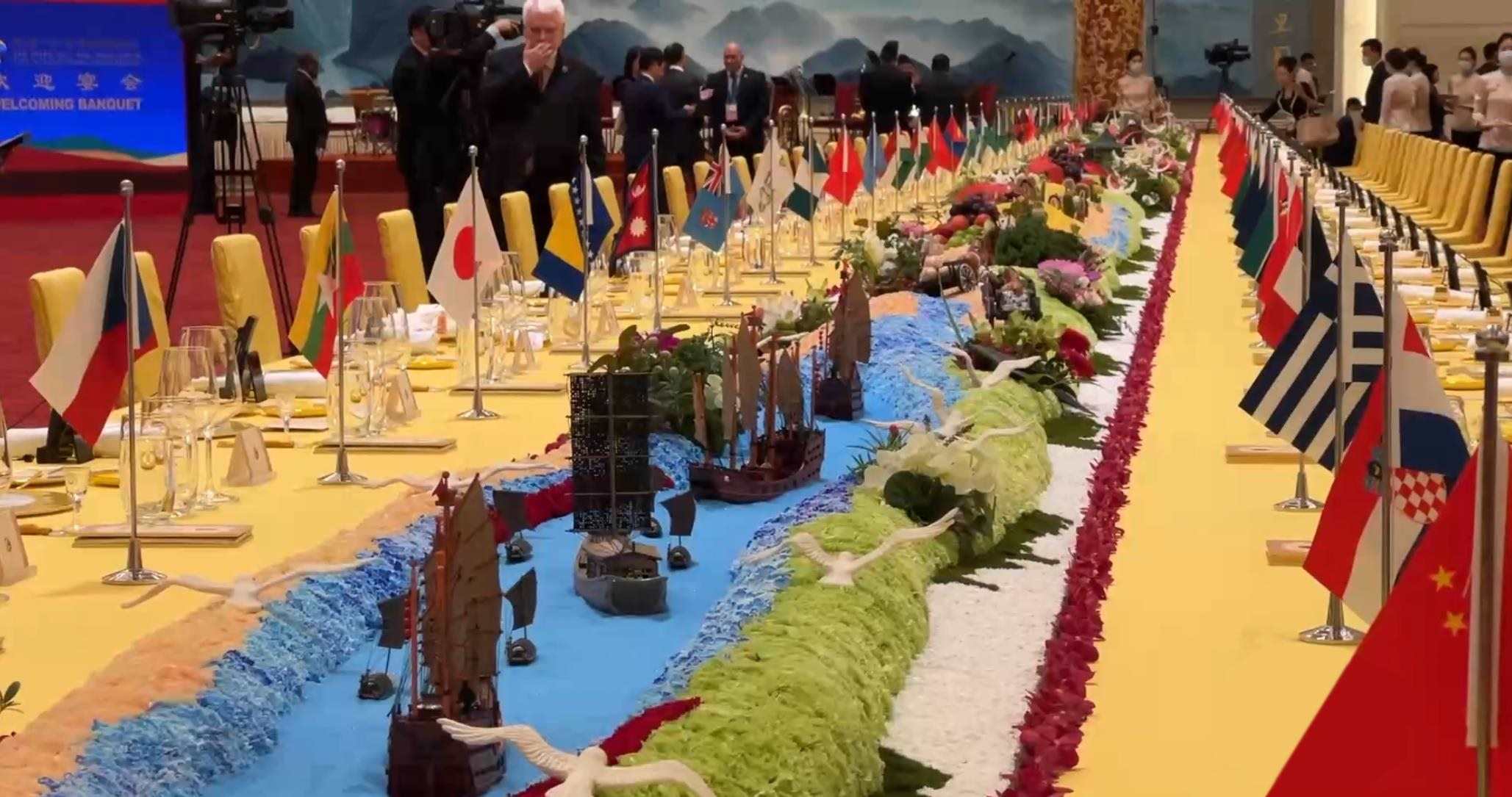 在10月17日晚舉行的歡迎宴會上,嘉賓們被這樣一個細節(jié)深深打動——晚宴餐臺以“撫古觀今、擁抱未來”為主題,南側展示著古代絲綢之路的微觀景象:海邊碼頭上擺放著對外出口的瓷器、絲綢、茶葉等貿易物資,路上擺放有從西域引進的蔬菜瓜果;餐臺北側為21世紀絲綢之路的景觀:以北京天壇的裝飾為起點,中間穿插高鐵、中歐班列、新能源汽車等擺件,展現各國互聯互通的景象……