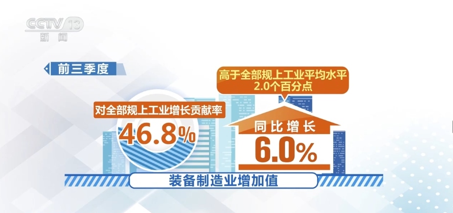 前三季度,在工業(yè)41個大類行業(yè)中,27個行業(yè)增加值實現(xiàn)增長,增長面達(dá)65.9%。其中,裝備制造業(yè)增加值同比增長6.0%,高于全部規(guī)上工業(yè)平均水平2.0個百分點,對全部規(guī)上工業(yè)增長貢獻(xiàn)率達(dá)46.8%。