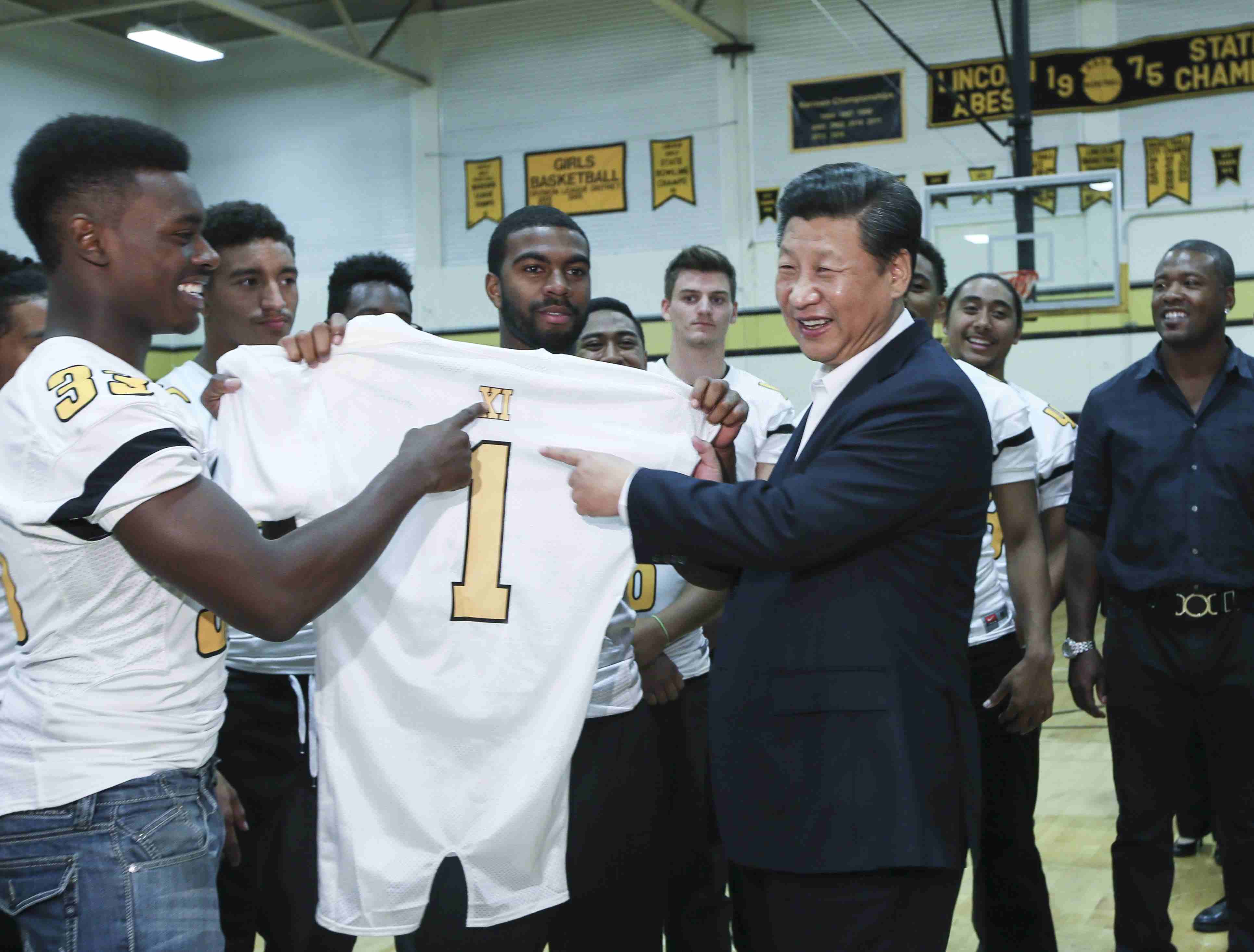 △ 2015年9月23日,國家主席習(xí)近平參觀美國塔科馬市林肯中學(xué)。這是習(xí)近平接受學(xué)生們贈(zèng)送的橄欖球衣。