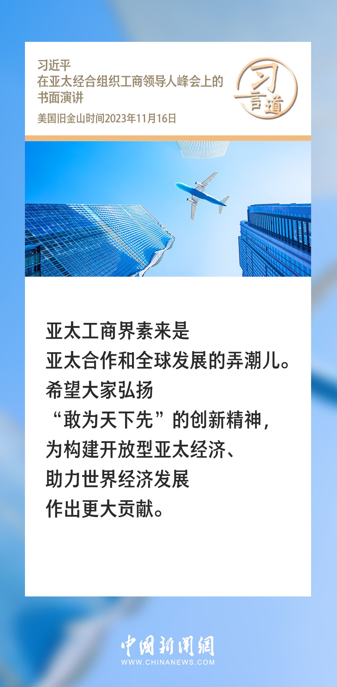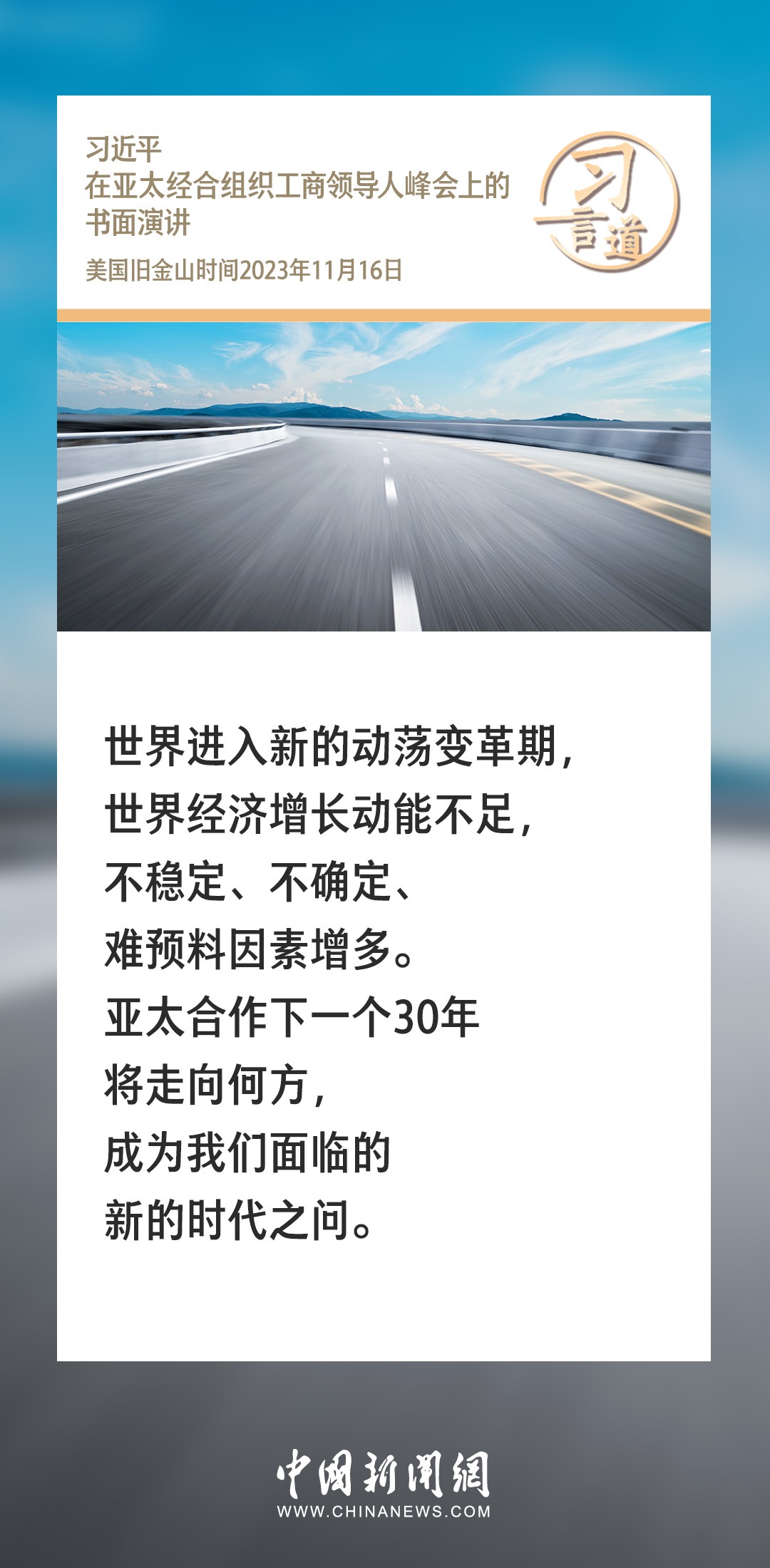 當?shù)貢r間11月16日上午,國家主席習(xí)近平向在舊金山舉行的亞太經(jīng)合組織工商領(lǐng)導(dǎo)人峰會發(fā)表題為《同心協(xié)力 共迎挑戰(zhàn) 譜寫亞太合作新篇章》的書面演講。習(xí)近平指出——