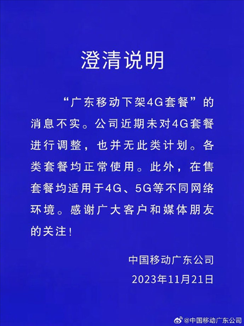 ·中國移動廣東公司:“下架4G套餐”消息不實,也無此類計劃。
