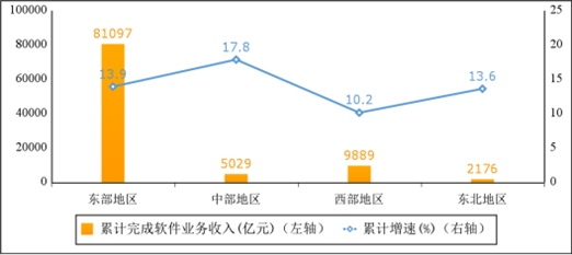 西部地區(qū)軟件業(yè)務(wù)收入小幅提升,中部地區(qū)增勢突出。1—10月份,東部地區(qū)完成軟件業(yè)務(wù)收入81097億元,同比增長13.9%,增速較前三季度回落0.2個百分點;中部地區(qū)完成軟件業(yè)務(wù)收入5029億元,同比增長17.8%,增速較前三季度提高5.7個百分點;西部地區(qū)完成軟件業(yè)務(wù)收入9889億元,同比增長10.2%,增速較前三季度提高0.3個百分點;東北地區(qū)完成軟件業(yè)務(wù)收入2176億元,同比增長13.6%,增速與前三季度持平。四個地區(qū)軟件業(yè)務(wù)收入在全國總收入中的占比分別為82.6%、5.1%、10.1%和2.2%。