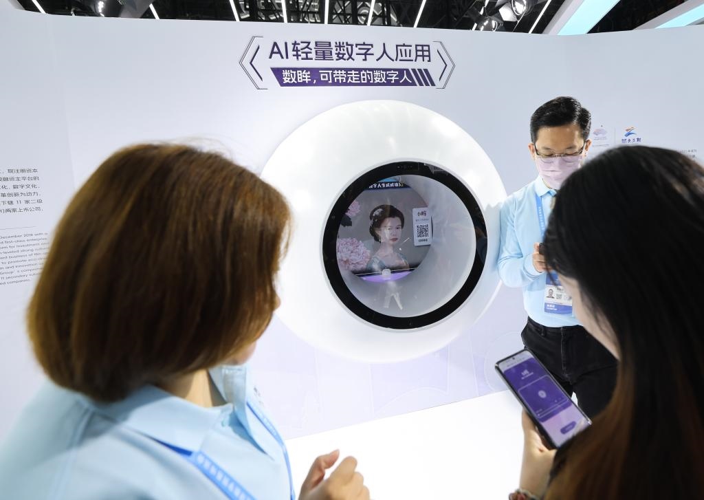 11月23日,參觀者在第二屆全球數(shù)字貿(mào)易博覽會上體驗(yàn)數(shù)字人應(yīng)用。新華社記者 徐昱 攝