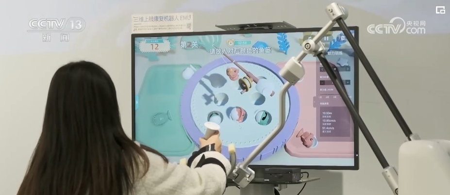 總臺(tái)記者 竇筠韻:幫助病人進(jìn)行康復(fù)的機(jī)器人,可以根據(jù)病人手部力量的多少進(jìn)行輔助推力,機(jī)器界面上還有各種有趣的游戲,使得康復(fù)訓(xùn)練不無(wú)聊。