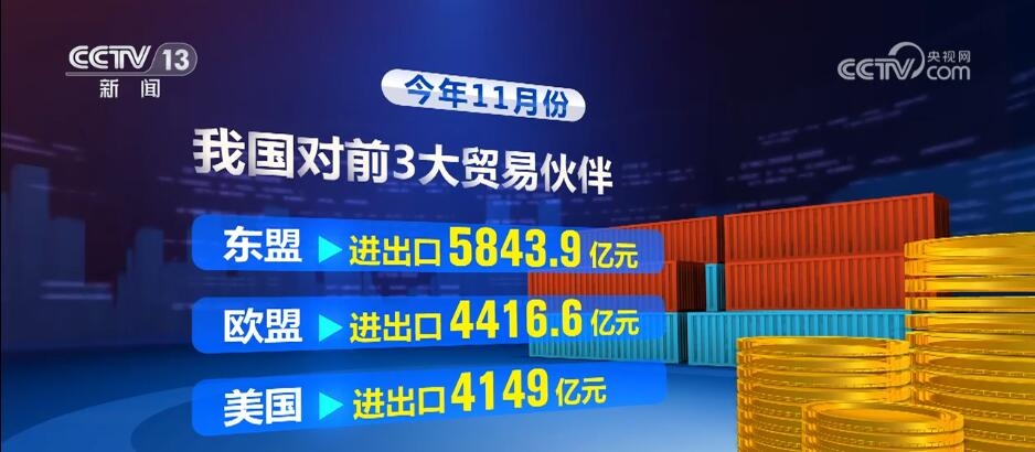 海關(guān)統(tǒng)計數(shù)據(jù)顯示,今年11月份,我國對前3大貿(mào)易伙伴東盟、歐盟、美國分別進(jìn)出口5843.9億元、4416.6億元、4149億元,合計占我國進(jìn)出口總值的38.9%;對共建“一帶一路”國家進(jìn)出口1.72萬億元。同期,我國與拉美、非洲、中亞五國進(jìn)出口延續(xù)良好態(tài)勢,分別增長9.3%、8.4%、43%。
