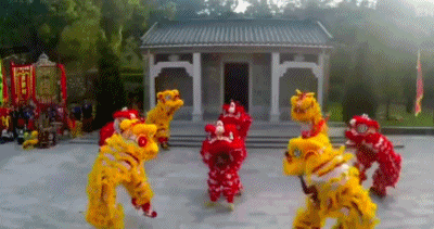 舞動的獅子騰起、跳躍、搖頭擺尾
